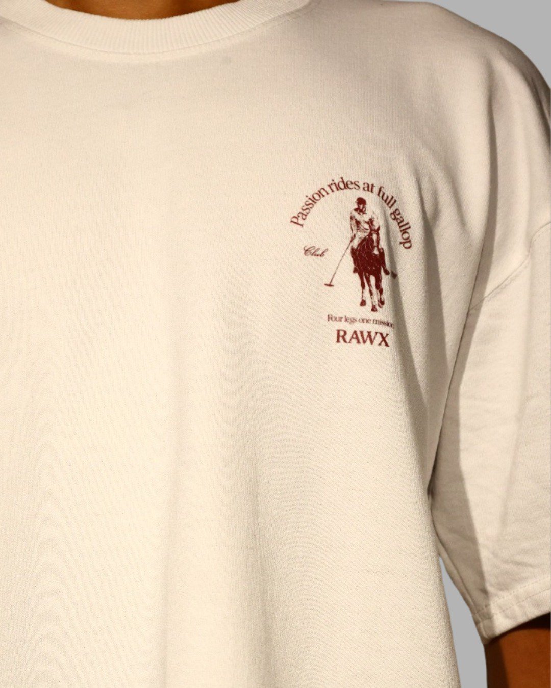 A crisp white tee featuring a vintage-inspired polo rider graphic in deep maroon. The front carries a minimal chest print, while the back showcases a bold equestrian artwork framed by the words “Passion rides at full gallop” and “Four legs one mission – RAWX.” A timeless blend of sport and lifestyle aesthetics.