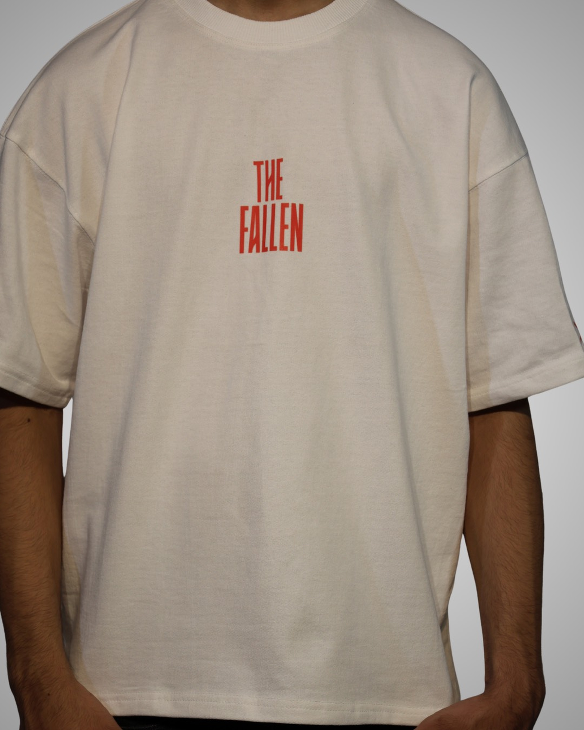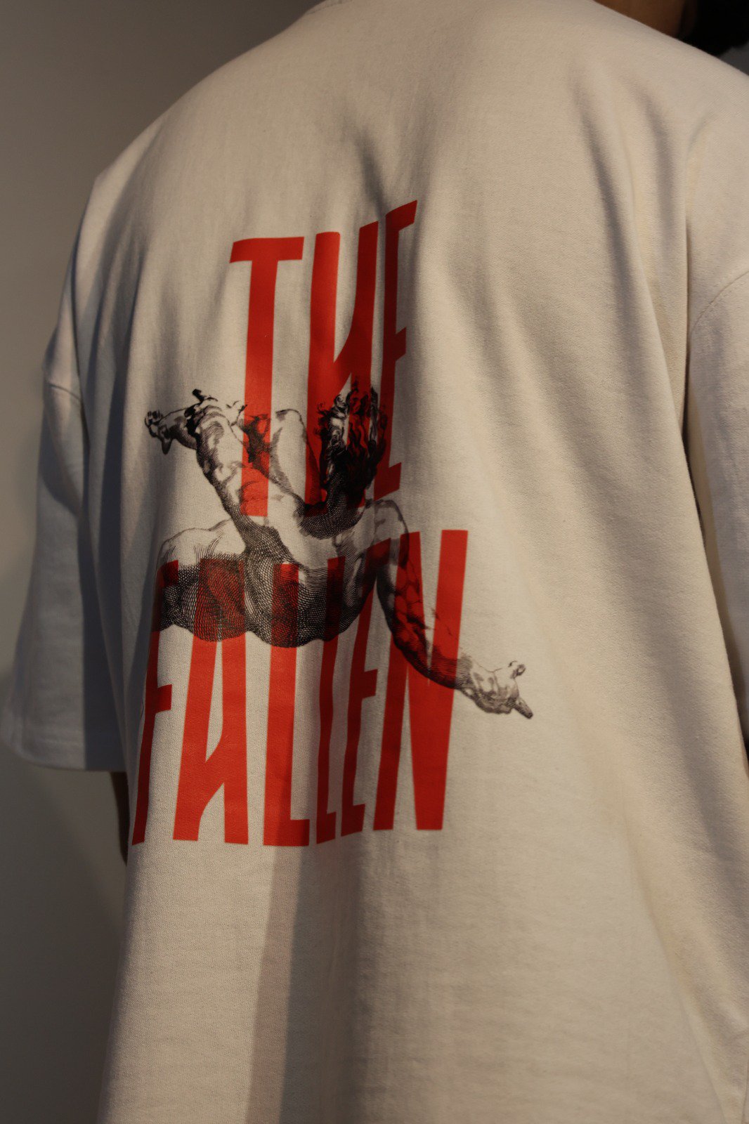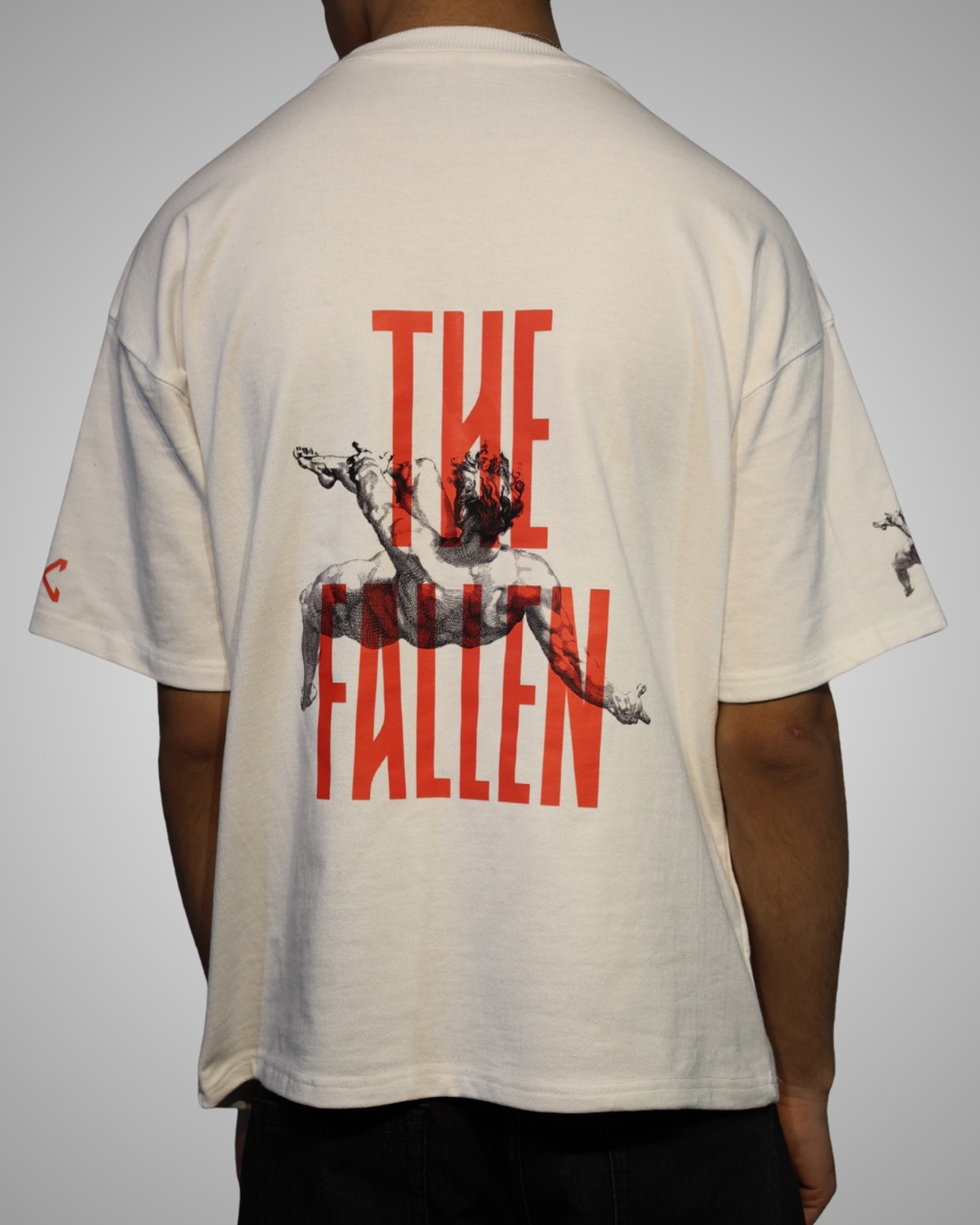 Overlaid on top of this classical imagery is the phrase “THE FALLEN” in a clean, modern font, providing a sharp contrast that makes the design truly unique. The deep red color of the text cuts through the monochromatic artwork, drawing the eye and adding a layer of contemporary urban edge to the historical subject matter. This juxtaposition of old and new makes the t-shirt a conversation starter and a true work of wearable art.